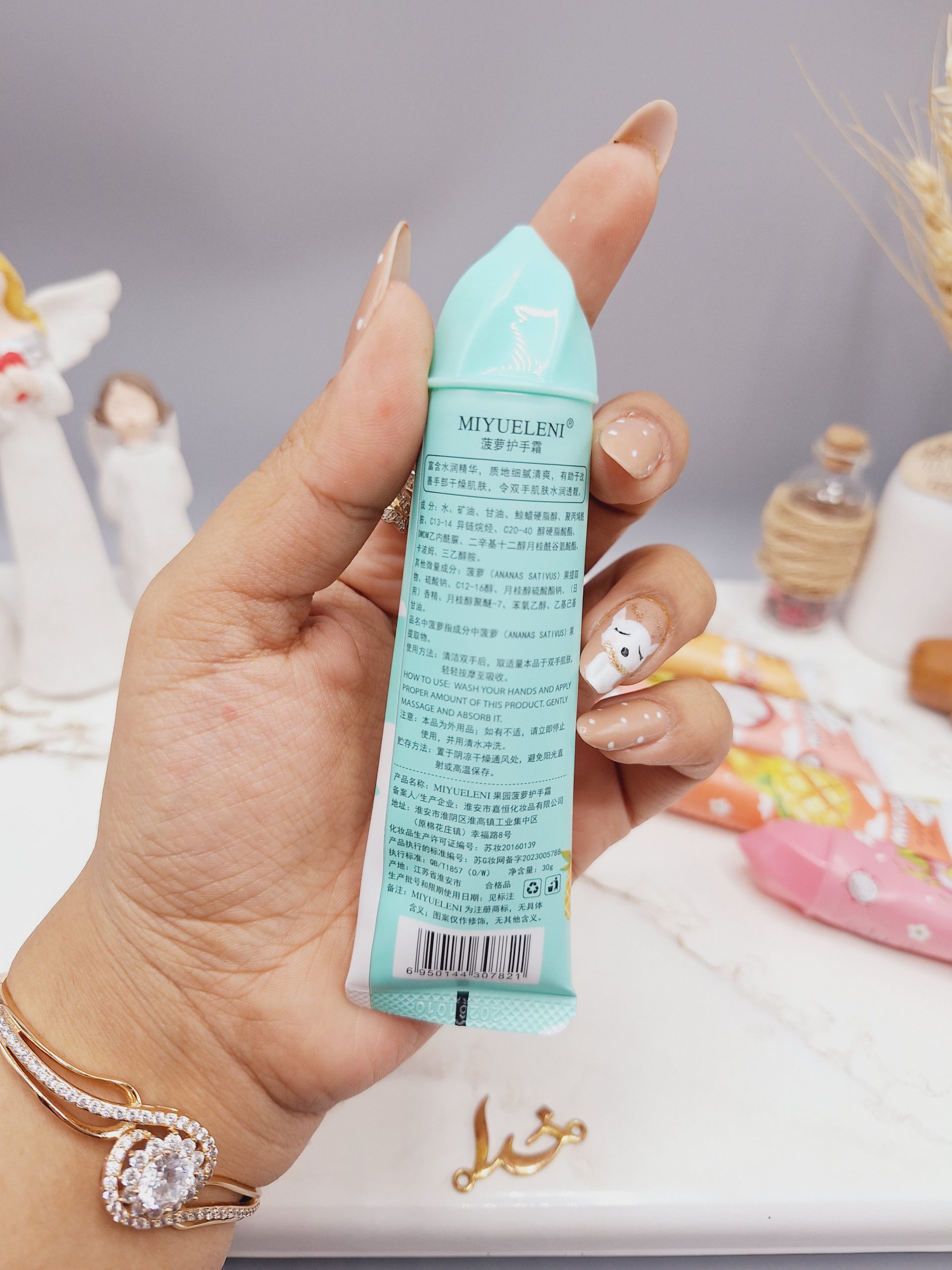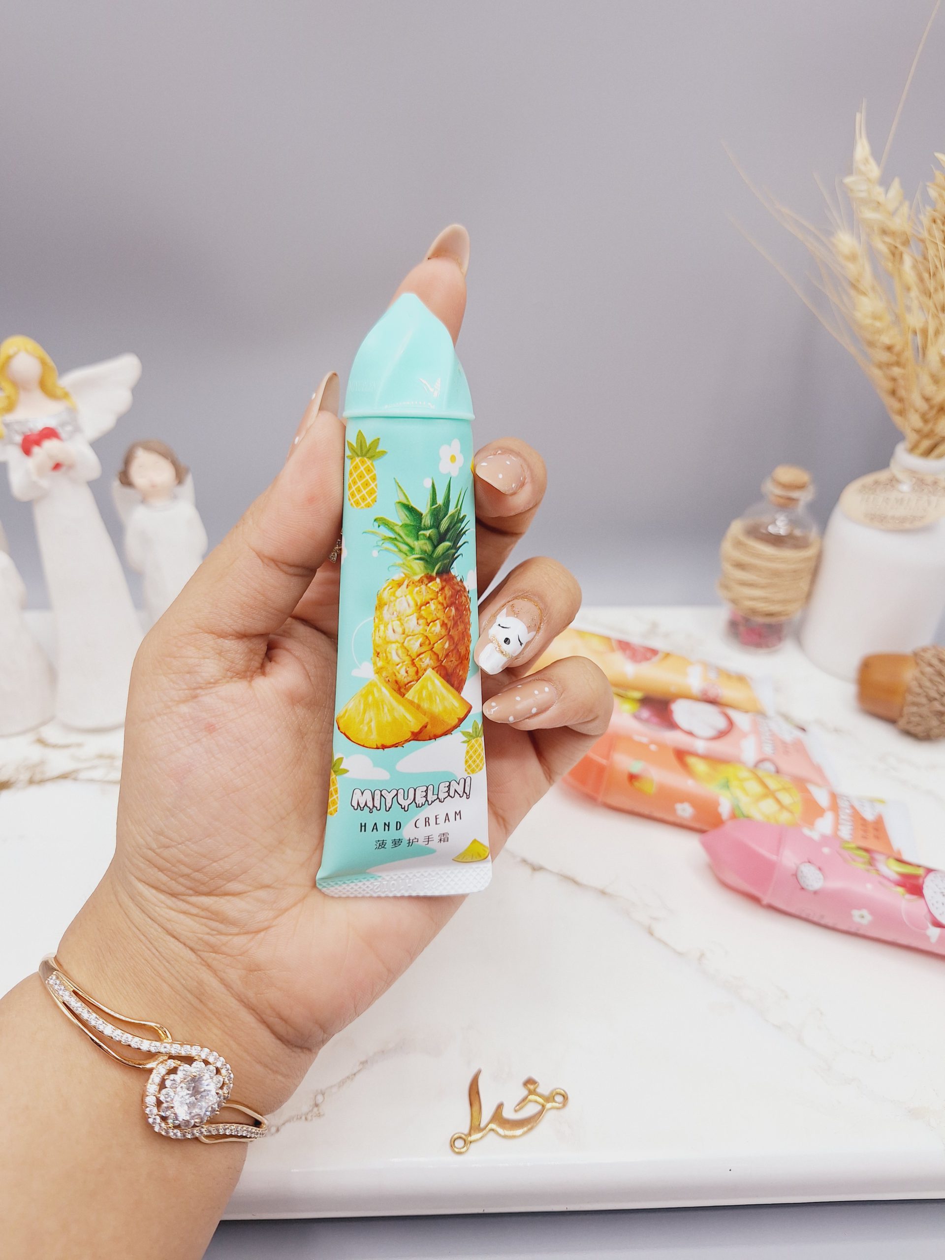 پک پنج عددی کرم دست مدل شکوفه طرح میوه های استوایی برند MIYUELENI کد 7890 برای مرطوب کردن، آبرسانی و نرم کردن دست تولید شده است که به شرح زیر است: