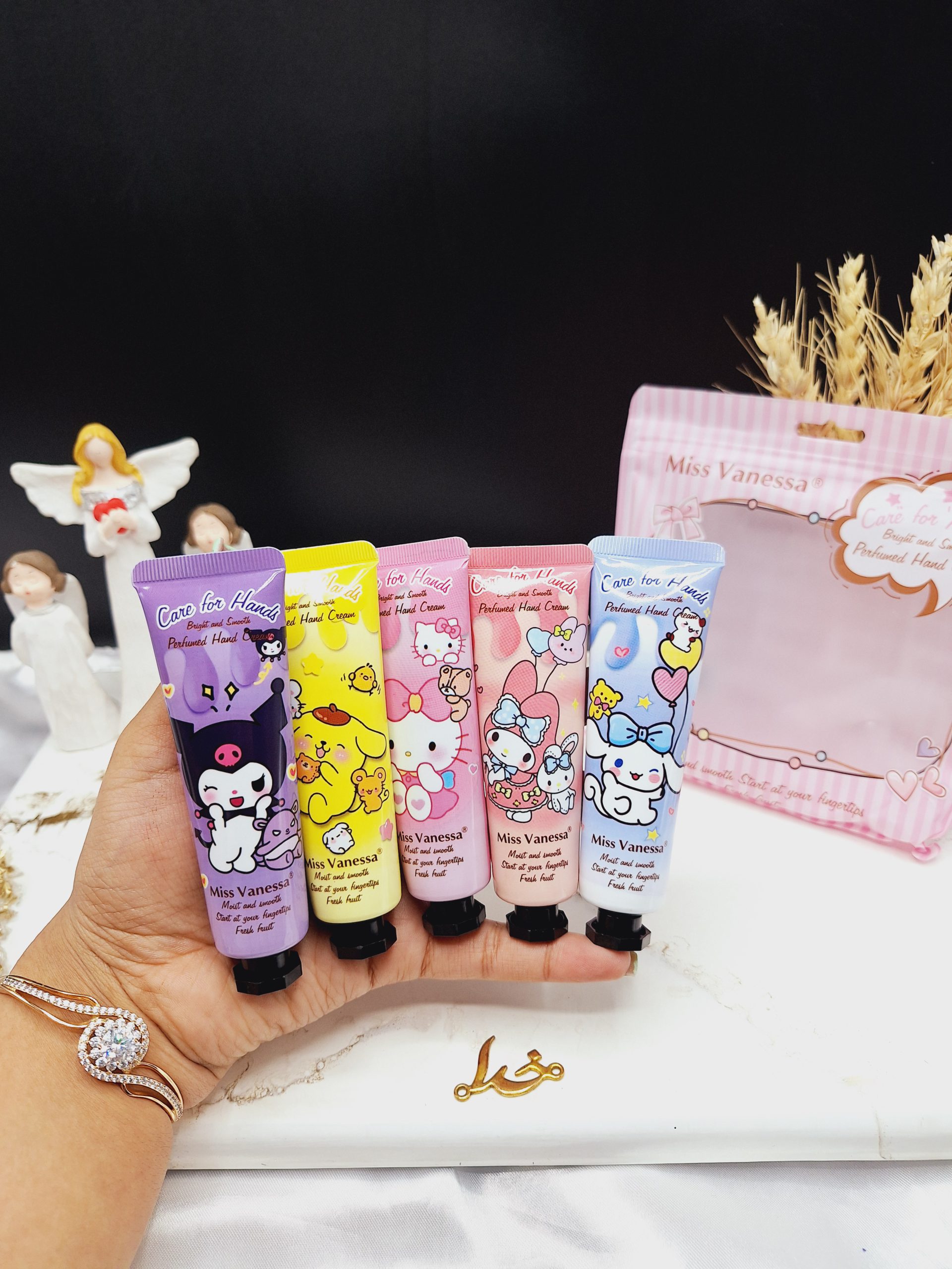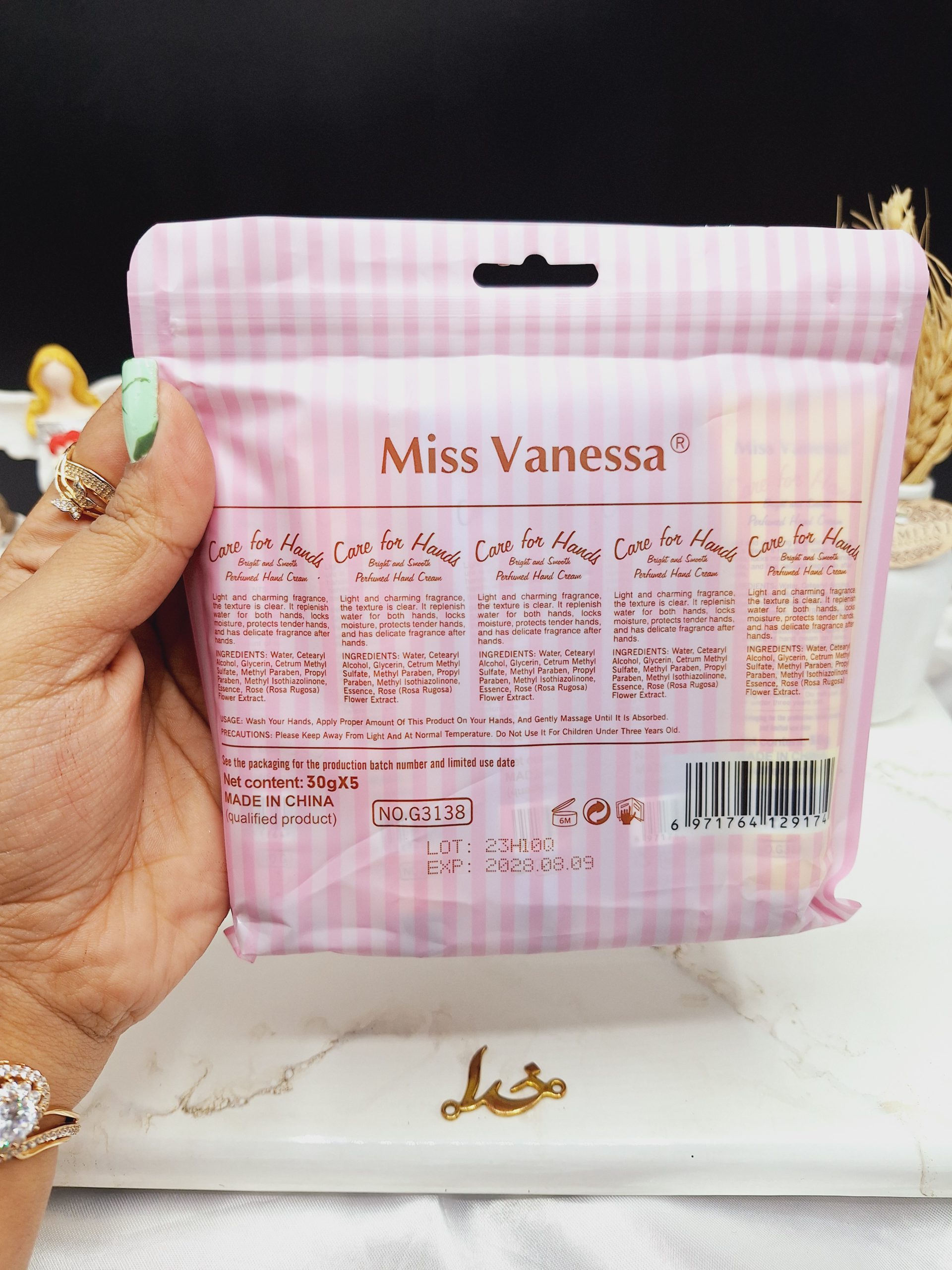 پک 5 عددی کرم دست فانتزی برند Miss Vanessa کد G3138 با رایحه عطر و میوه یکی از بهترین کرم های مرطوب کننده است که می تواند از پوست در برابر مشکلات خشکی محافظت کند
