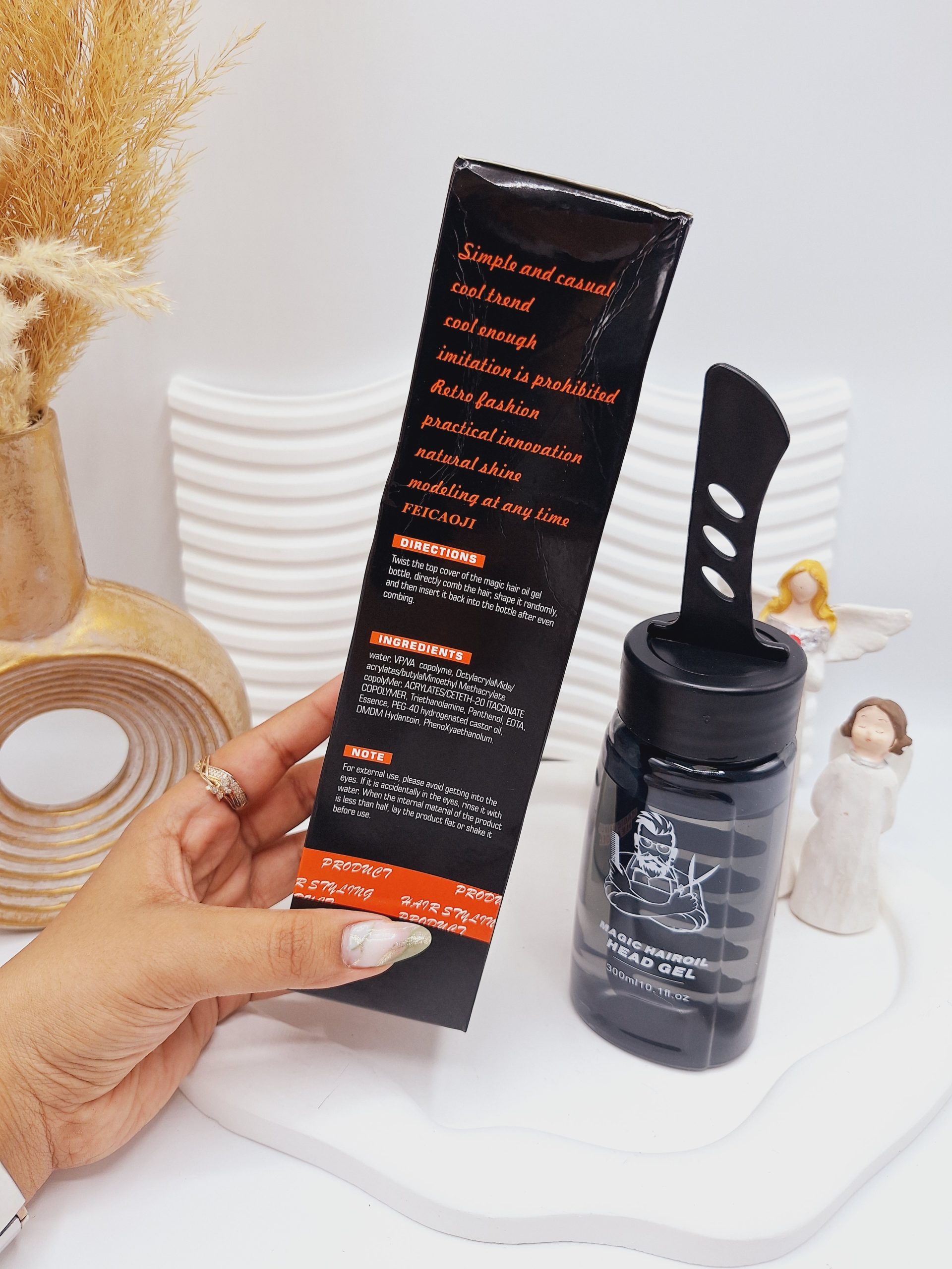 اثربخشی محصول: بافت تازه است، چسبناک نیست، سریع خشک می شود و ماندگار است، بدون برش های سفید. با شانه روغنی مخصوص به خود، به راحتی می تواند انواع مدل های موی شیک و شیک مختلفی را در عرض یک دقیقه برای شما شکل دهد و موهای شما را ظریف، براق و صاف کند و جذابیت را به شما نشان دهد. نحوه استفاده: پیچ را باز کنید و محصول را با شانه خود فرو کنید. برای ایجاد شکل ایده آل از شانه به طور مستقیم استفاده کنید. بعد از مدل سازی، شانه را دوباره داخل بطری قرار دهید و آن را پیچ کنید.