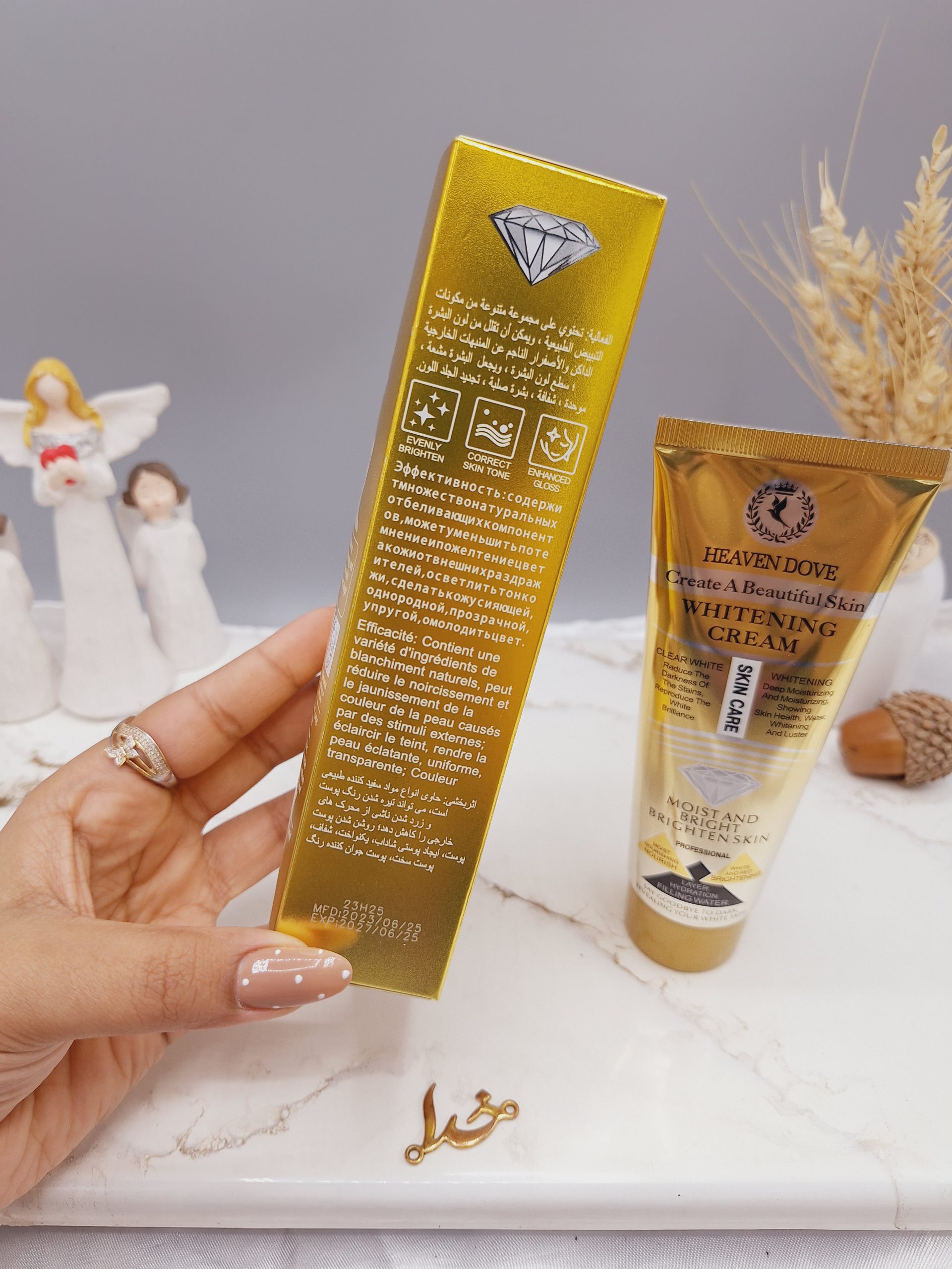 کرم تیوپی مراقبت از پوست سفید کننده و آبرسان پوست برند HEAVEN DOVE کارتن طلایی کد HD_1053 A یک سفید کننده فوری هست که شما را در مواقعی که وقت ندارید از چند کرم بی نیاز میکند این محصول بسیار با کیفیت است و مورد توجه مصرف کننده گان قرار گرفته است.