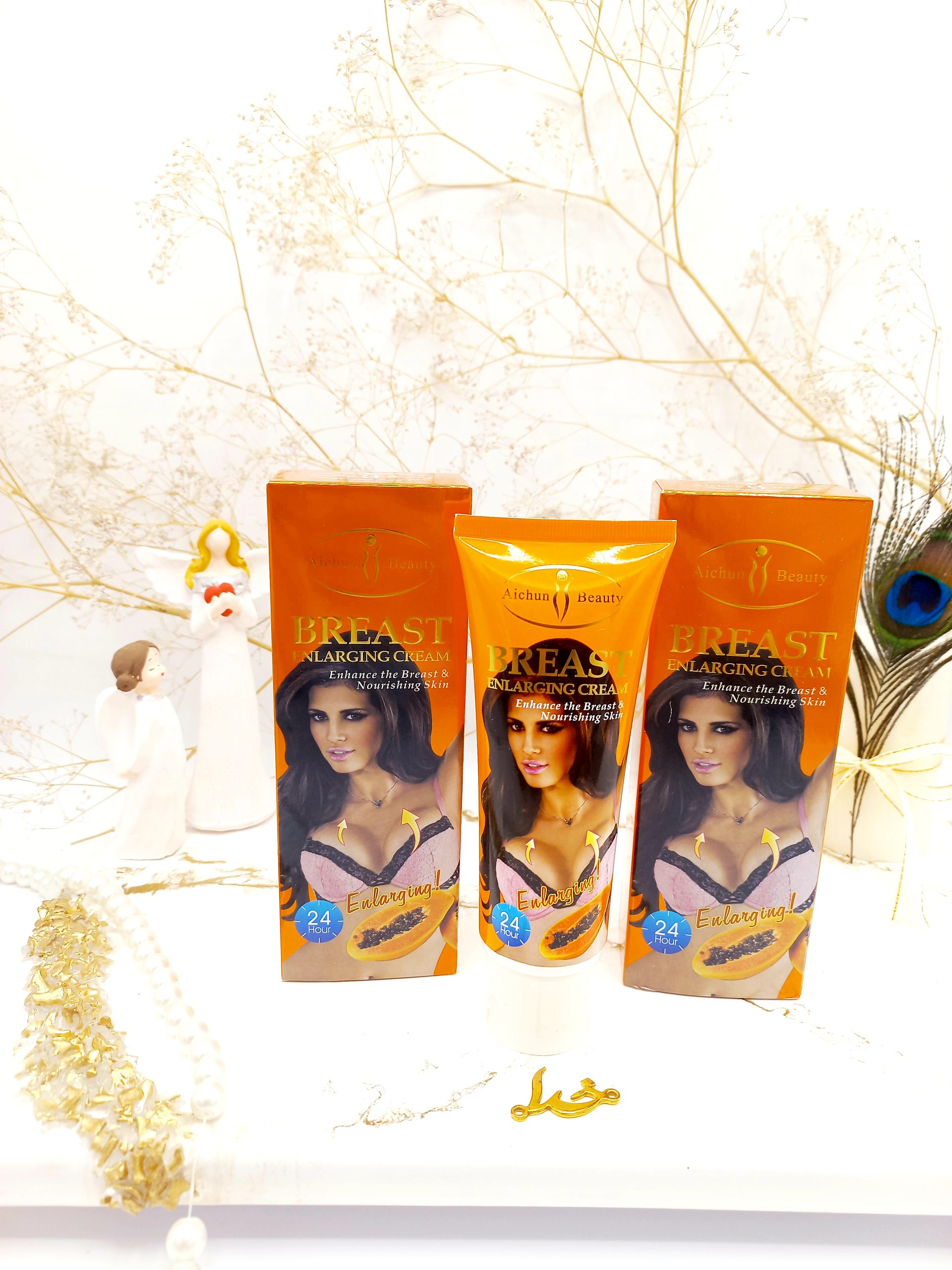 کرم حجم دهنده سریع سینه عصاره پاپایا آیچون بیوتی AICHUN BEAUTY با فرمولاسیون خاص باعث حجم دهی به سینه ها شده و آن ها را سفت و محکم می کند. این کرم سینه های شما را تقویت، محکم و بلند کرده و باعث افرایش جذابیت آن ها می شود. این محصول به صورت موضوعی بوده و از گیاهان طبیعی برای بزرگ کردن، سفت کردن، تغذیه و کاهش چین و چروک سینه ساخته شده است. همچنین با رفع چین و چروک باعث جوانی پوست شده و آن را نرم، لطیف و صاف می کند. این کرم دارای تاثیرگذاری سریع بوده و در کمترین زمان ممکن شما را به سایز دلخواه می رساند. این محصول برای سفت شدن سینه و ایجاد فرمی جذاب بسیار موثر خواهد بود. همچنین به سفید و روشن شدن پوست کمک می کند.