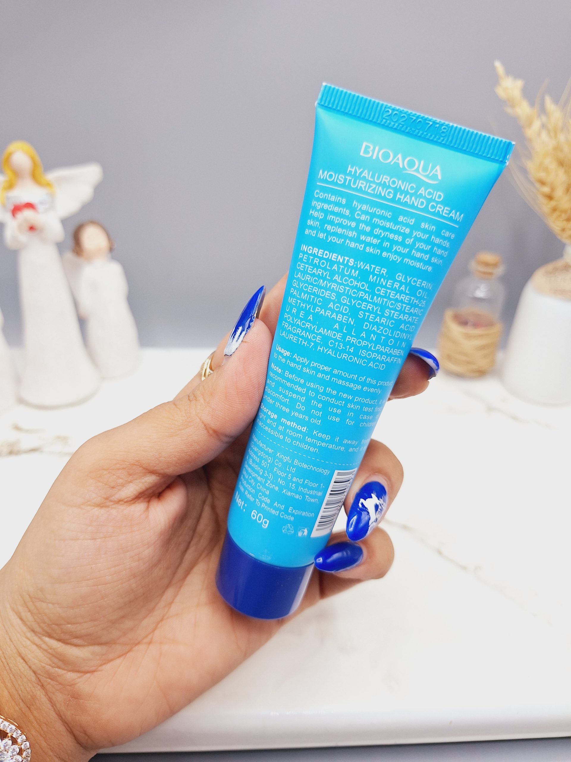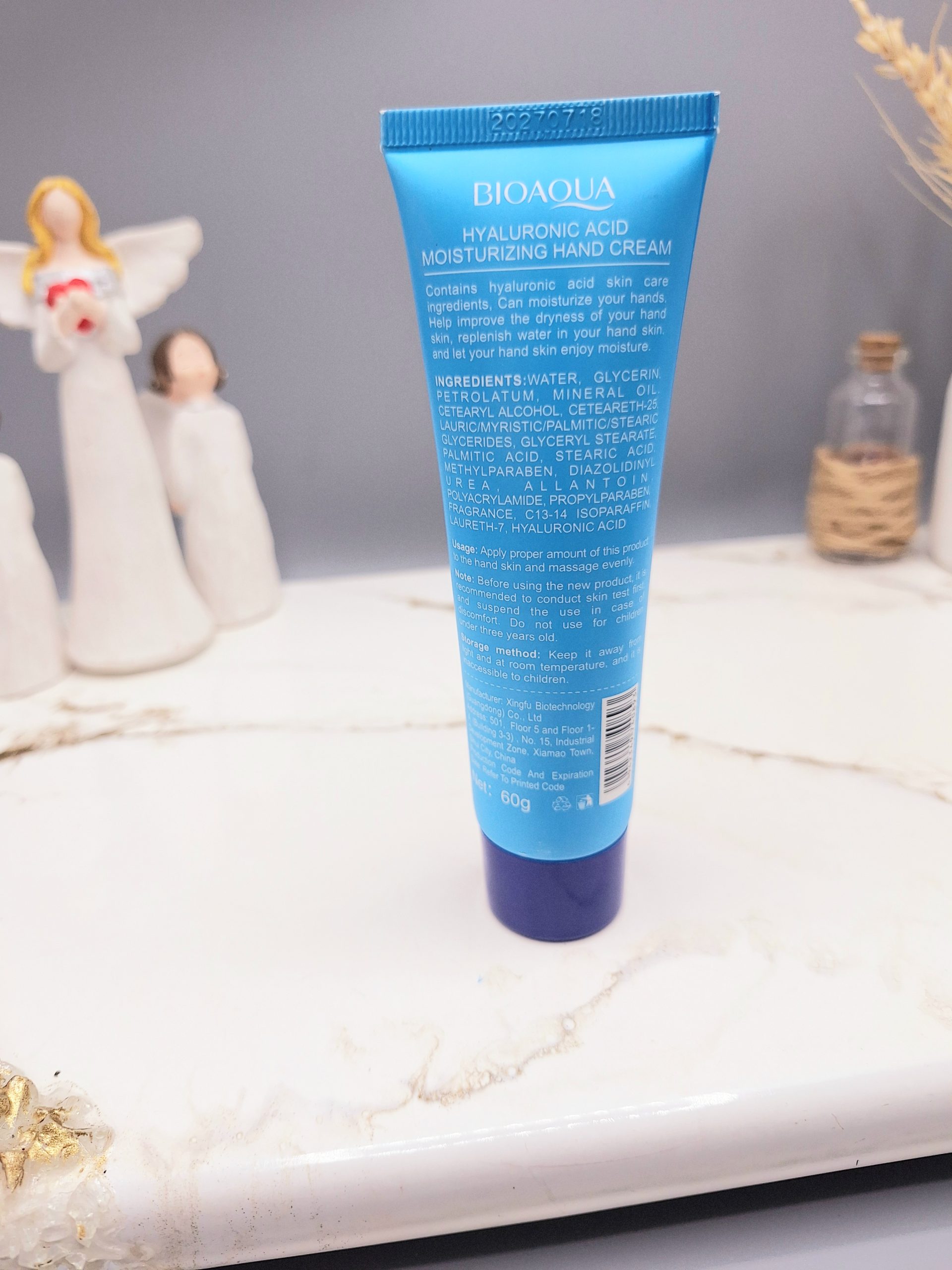 کرم دست تیوپی هیالورونیک اسید بیوآکوا 60 گرم حاوی عصاره گیاهان طبیعی ، هیالورونیک اسید ضد چین و چروک قوی و مرطوب کننده پوست و روشن کننده و مغذی پوست دست و بدن و کنترل کننده چربی پوست و سفید کننده پوست و نرم کننده و آبرسان پوست می باشد.
