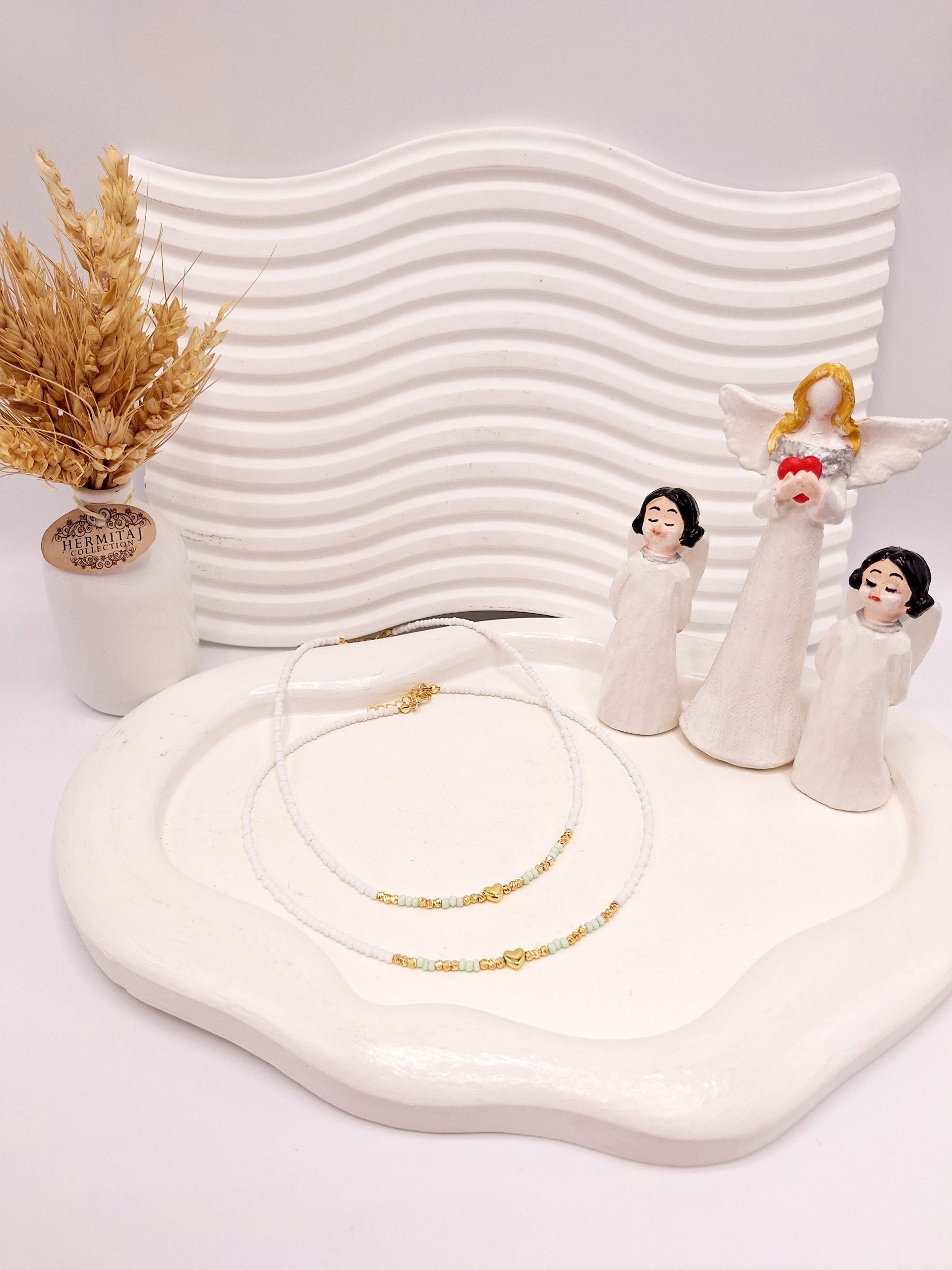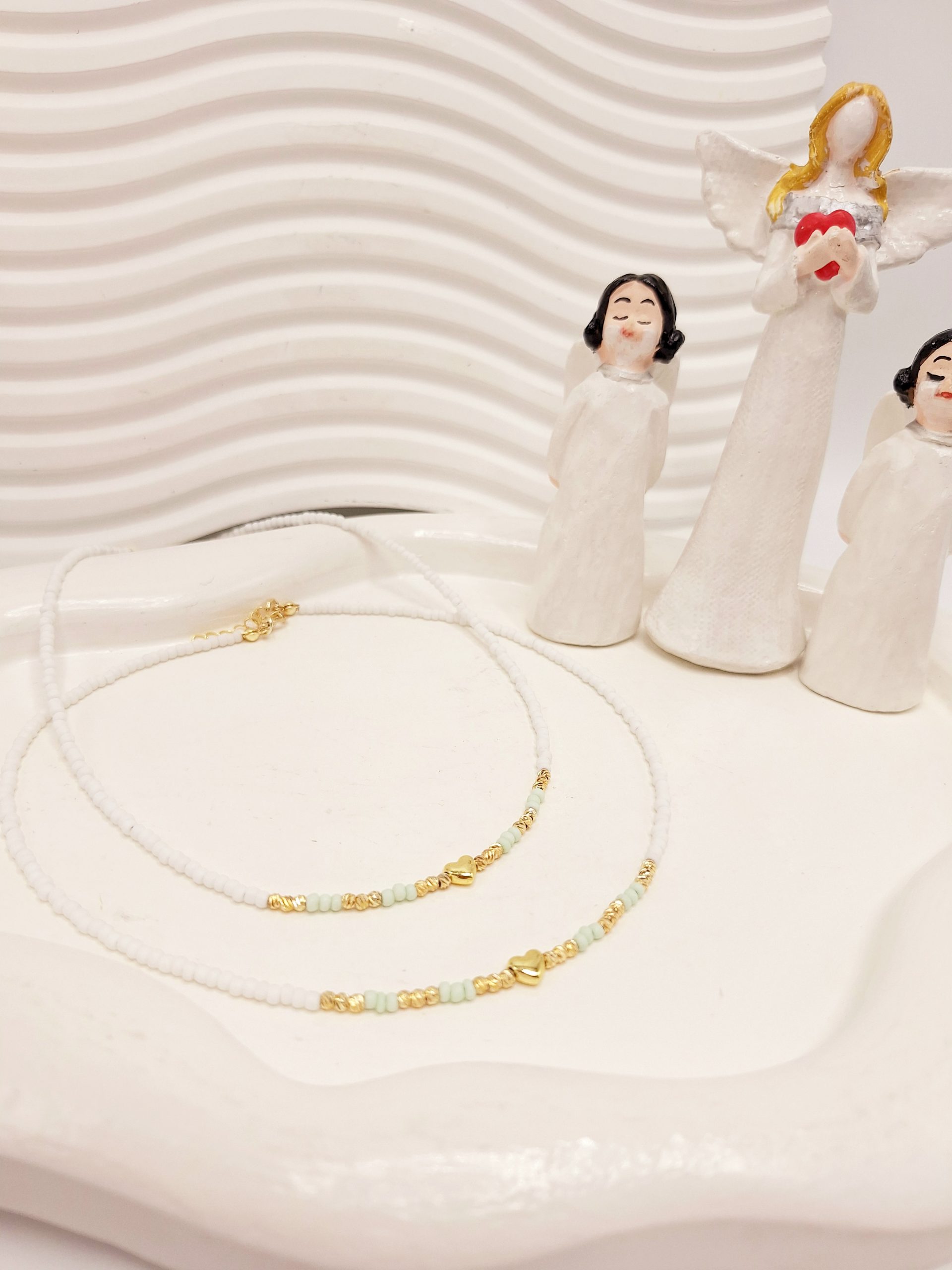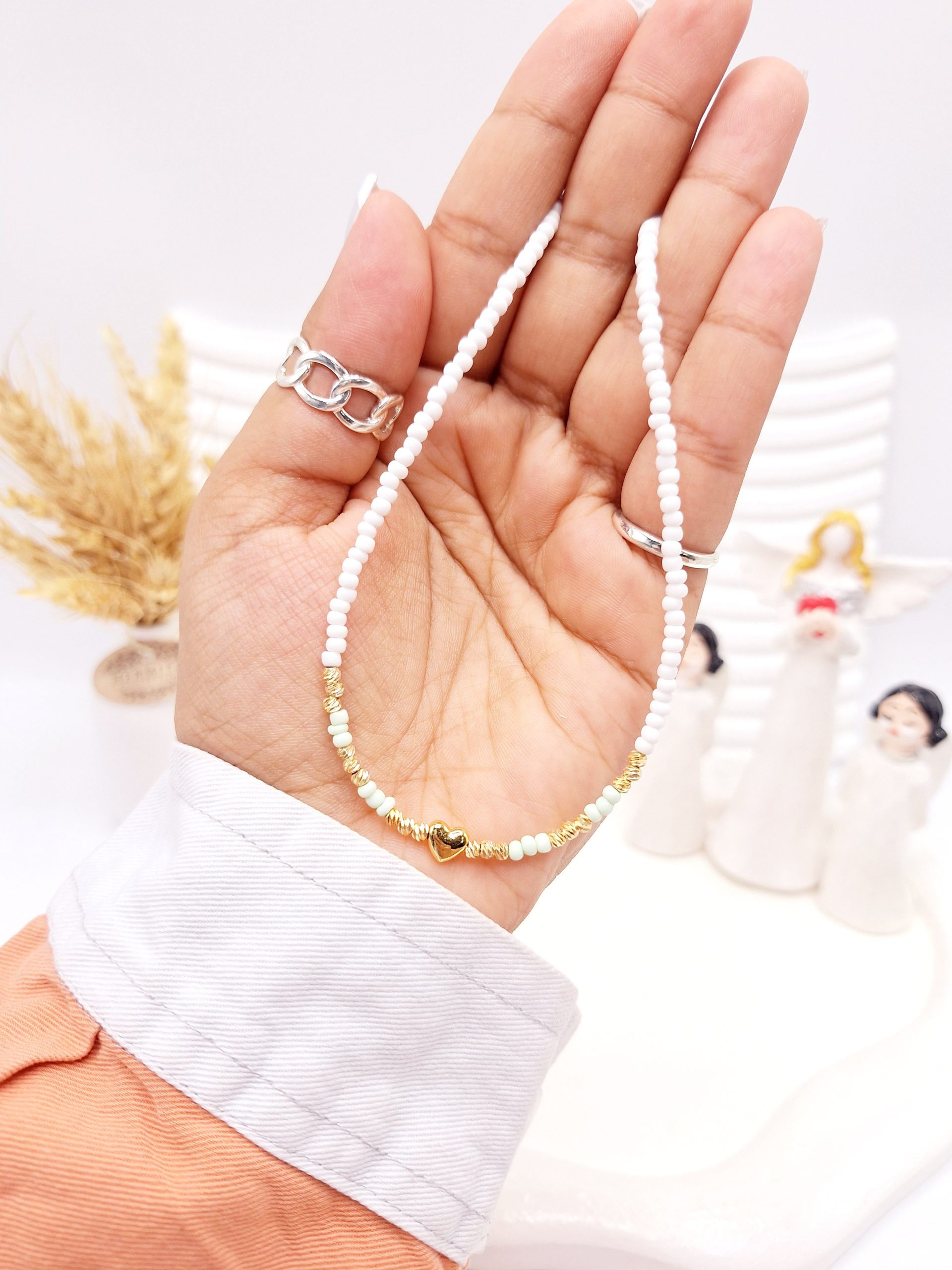 گردنبند تابستونی مراورید و قلب رنگ سبز