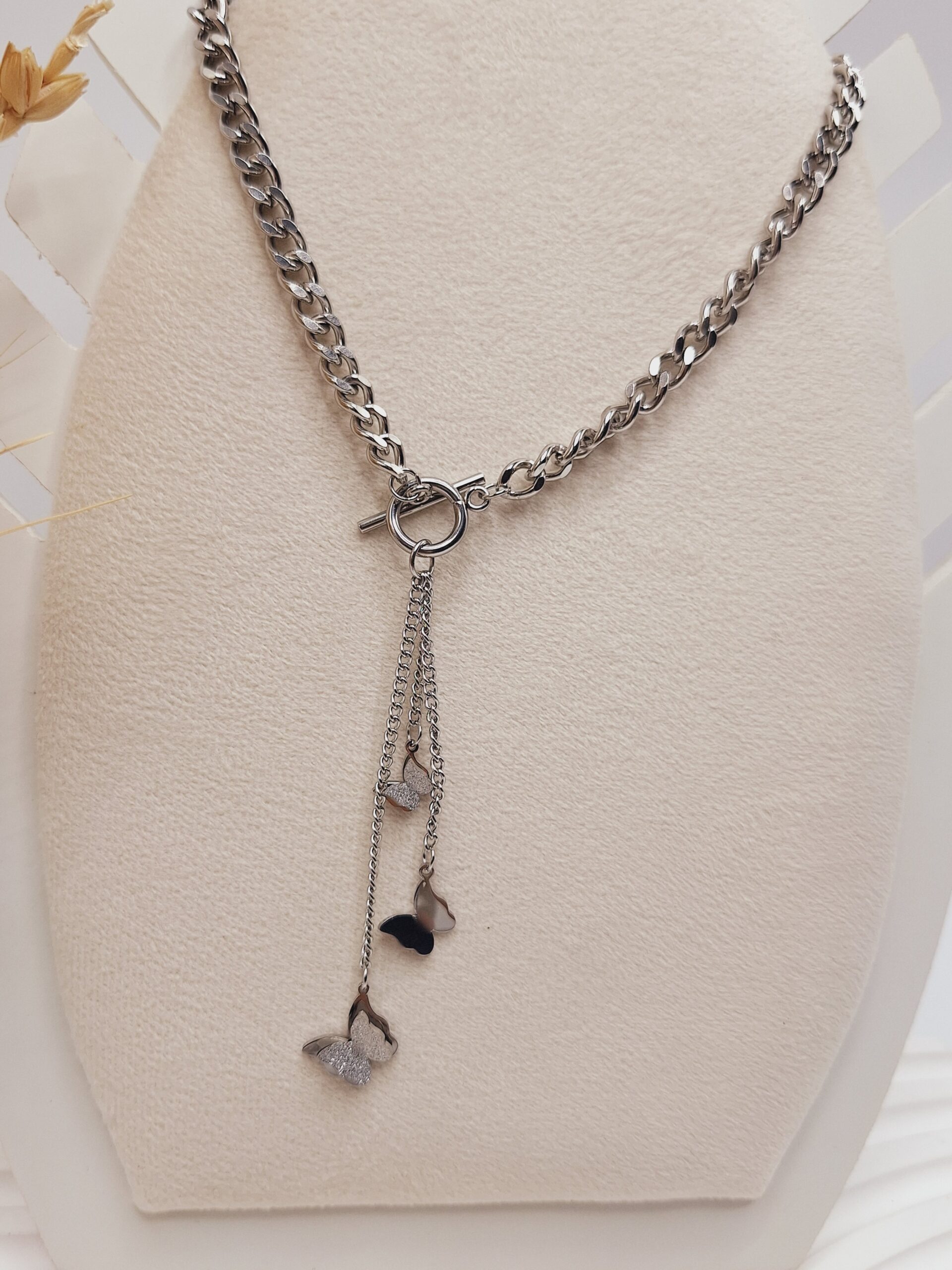 گردنبند زنجیری مدل قفل پروانه نقرهای یک اکسسوری فانتزی و شیک است 💎🦋. طراحی زنجیری ظریف با قفل پروانه نقرهای، جلوهای خاص و لوکس به استایل شما میبخشد و مناسب استفاده در روزمره، مهمانی و هدیه دادن میباشد 🎉🎁