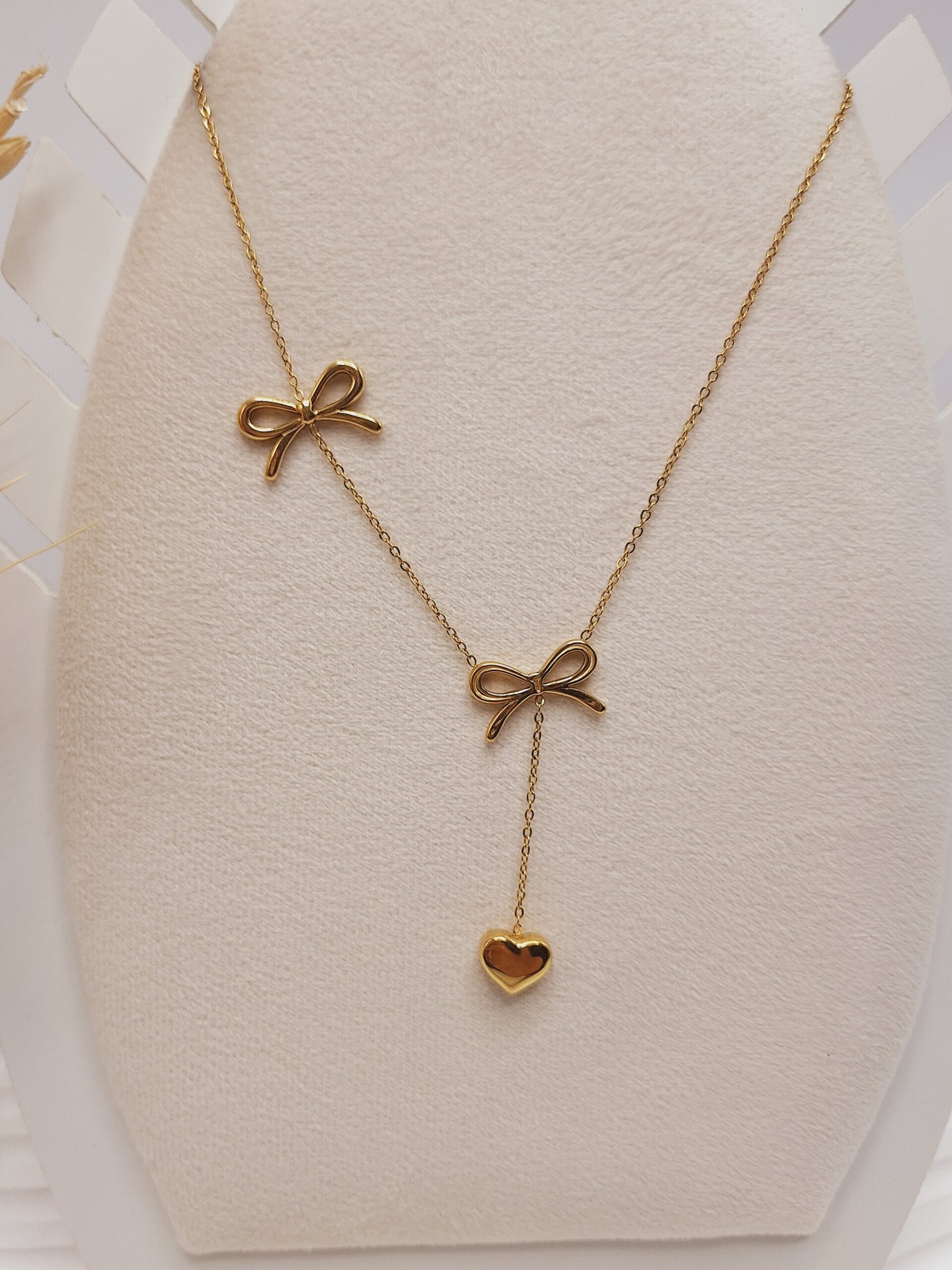 گردنبند طرح پاپیون و آویز دار قلب طلایی یک اکسسوری شیک و فانتزی است 💎🎀💖. طراحی ظریف پاپیون و آویز قلب، جلوهای دوستداشتنی و لوکس به استایل شما میبخشد و مناسب استفاده در روزمره، مهمانی و هدیه دادن میباشد 🎉🎁