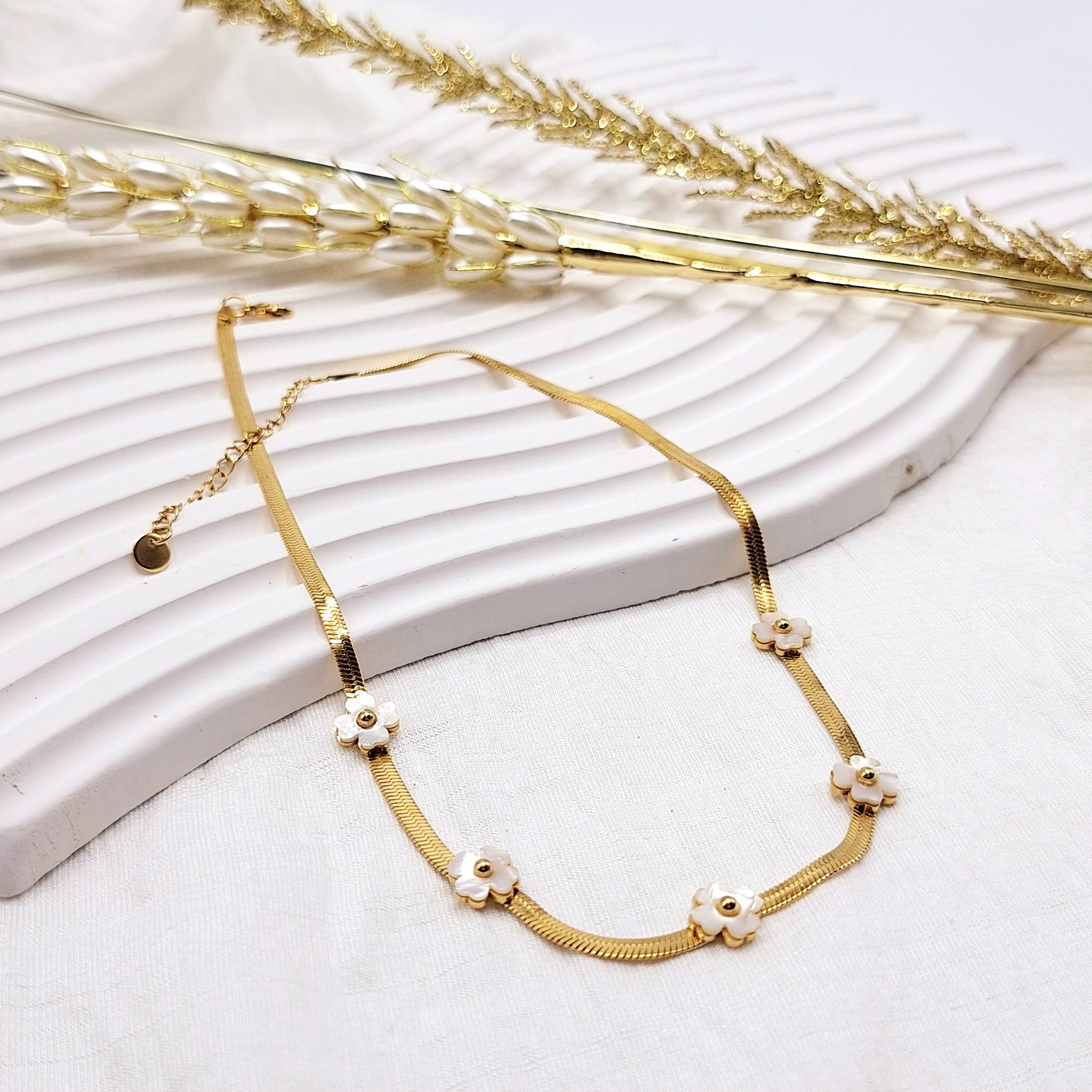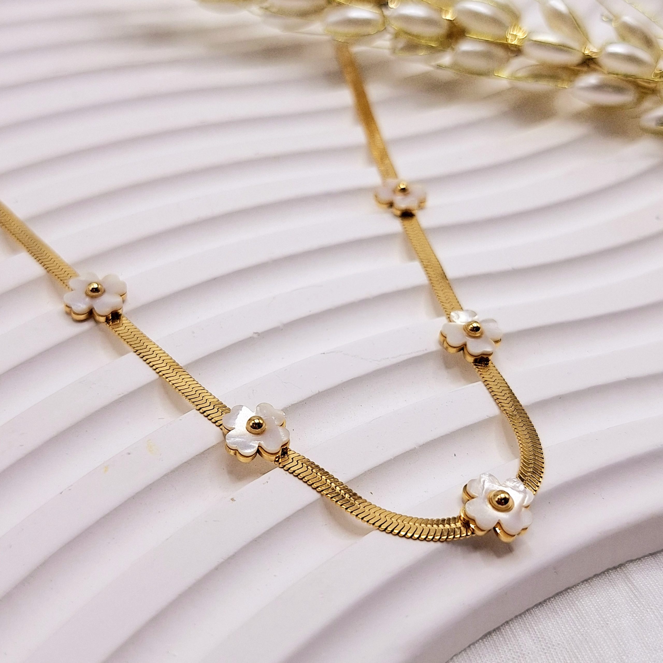 - ۱ عدد گردنبند ماری طلایی طرح گل سفید استیل