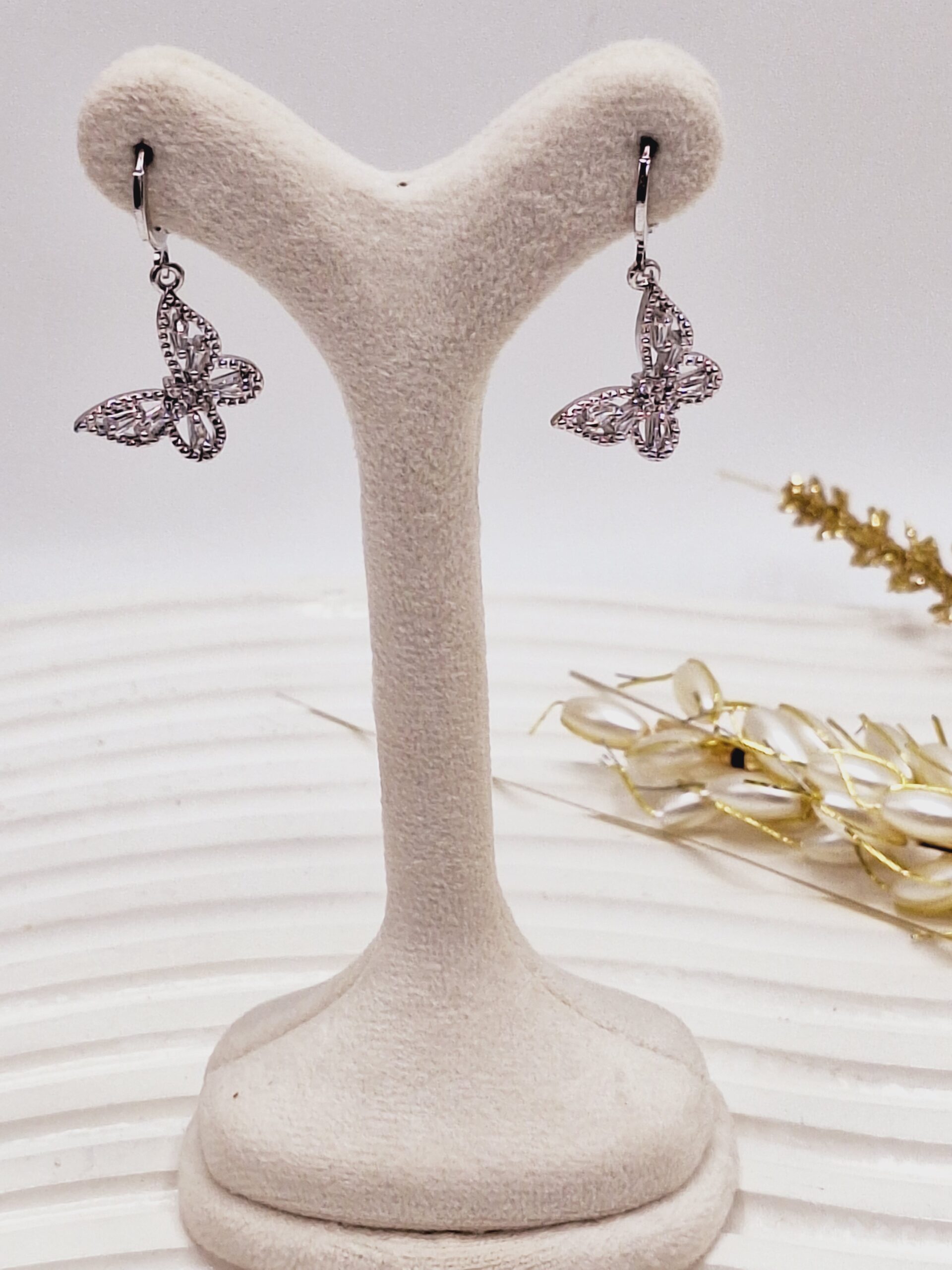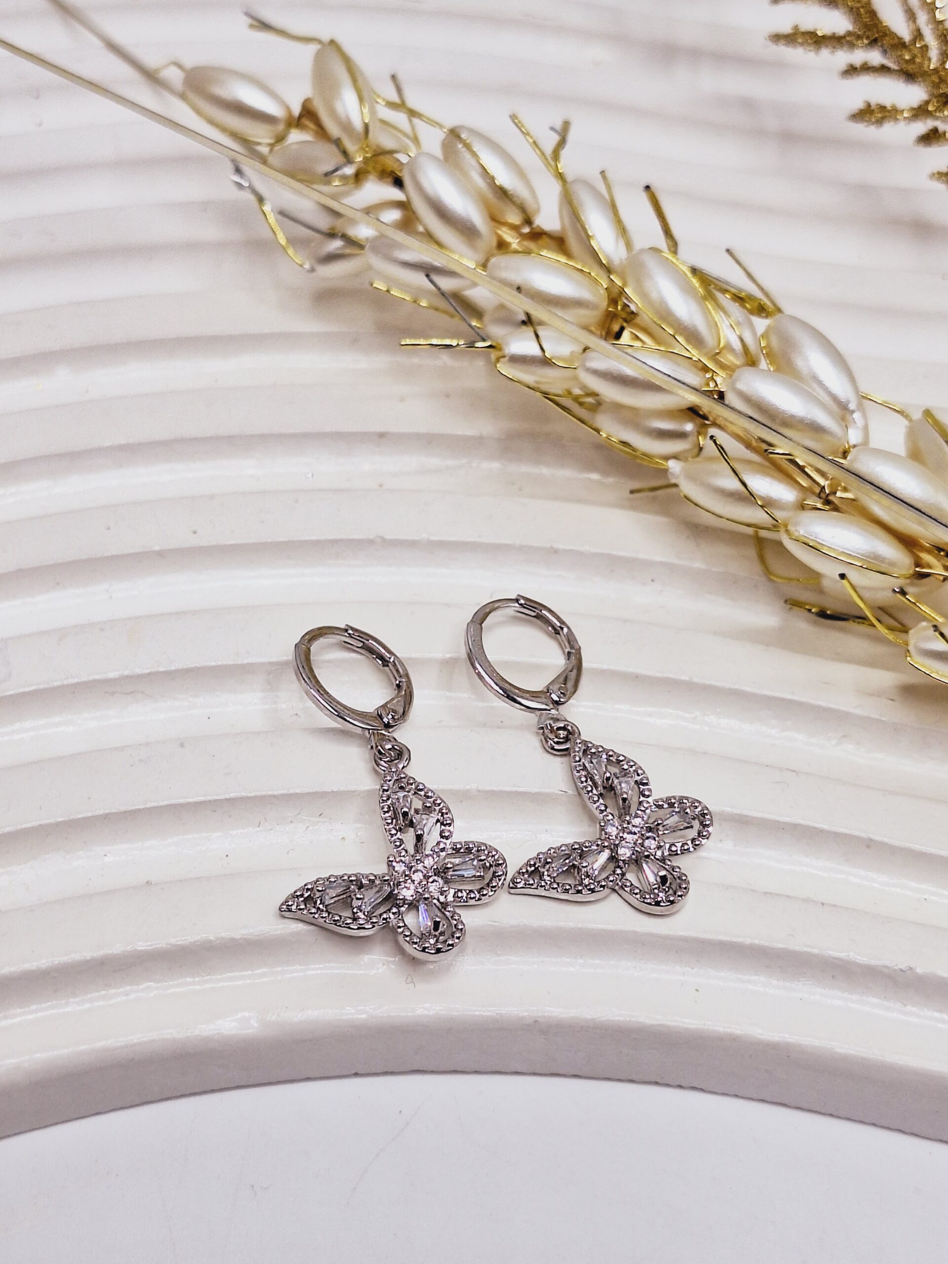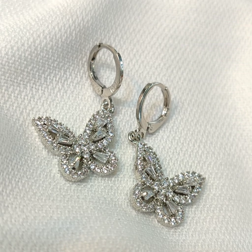 گوشواره برنجی مدل پروانه نگین دار نقره ای